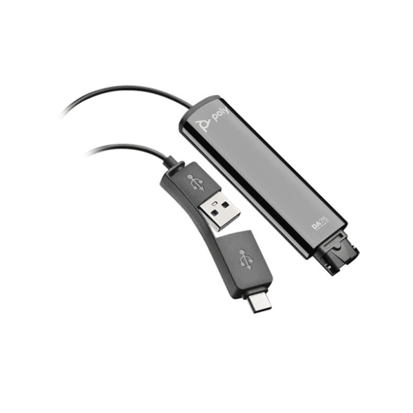 The Poly/Polycom 218266-01 DA75 QD To USB-A & USB-C Smart Digital Adapter Cable has a streamlined design with no controls that ensures there are no distractions for anyone using it. The DA Series of digital adapters go from USB to QD enabling call centres to take their existing headsets that work on legacy on-premises desk phones and move them to cloud-connected softphones on a PC.