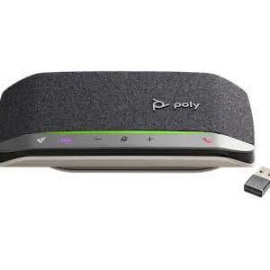 The Poly Sync 20 USB-C Speakerphone is a speakerphone that gives you professional audio quality in the office, on the road, or at home. Designed to work with almost any softphone, it is certified by Zoom. The device has convenient capacitive buttons including a programmable button for redial, play/pause music, and more. Sync 20 connects via USB-C or Bluetooth — your choice. The 28-inch USB-C cable connects to any computer with the newer connection, Windows, or iOS. Use the smartphone's USB-A port to charge a smartphone a convenient external battery. Sync 20 provides professional audio quality for communications and for music. It is a full-duplex speakerphone that uses a steerable microphone array with a 7-foot pickup. Sync 20 is IP64 rated. Use the included carrying case when you're on the go. Use the included lanyard to carry the speakerphone safely.